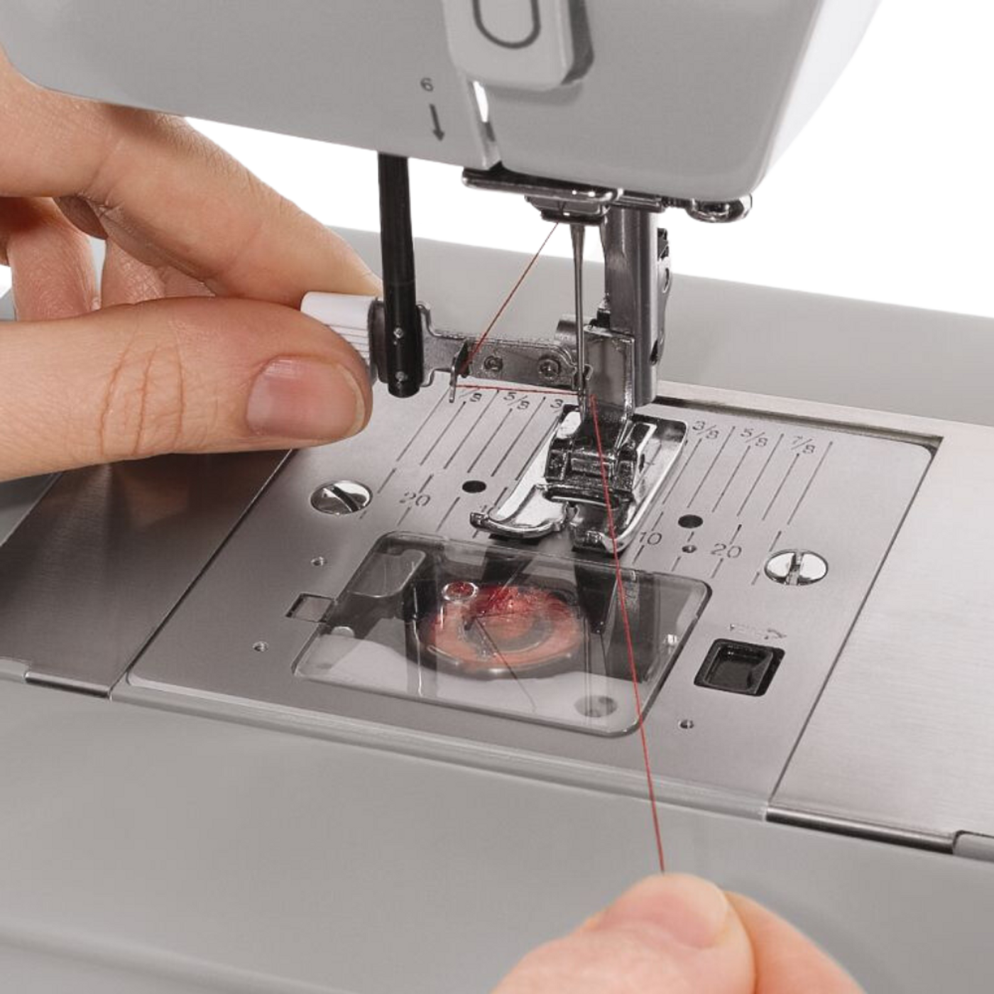 Complete with a heavy duty metal interior frame, stainless steel bedplate and extra-high sewing speed, this machine can sew through just about anything.